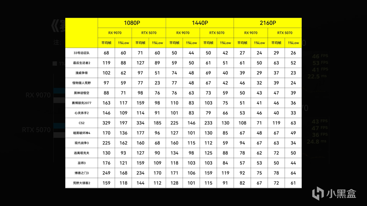 当分辨率提高至4K后,同样是9070以微弱的帧数领先于5070。