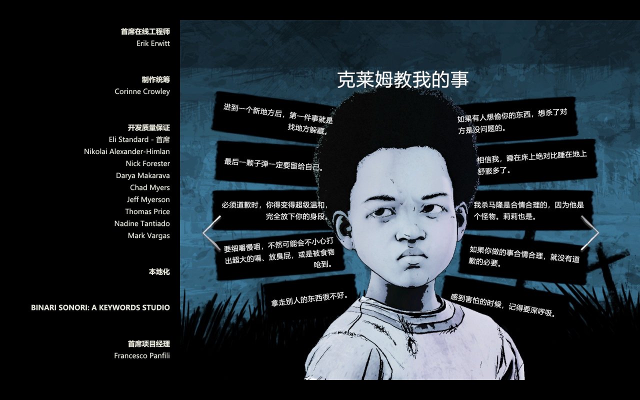 克莱从依赖者成长为能独立决断的幸存者,同时收养了孤儿AJ(阿尔文的孩子)
