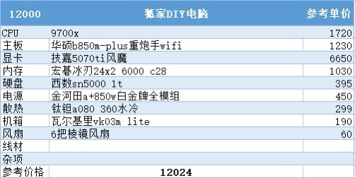 到了12000這個價位就可以在97x加5070ti的基礎上將其他所有配件升級一番使其更加均衡