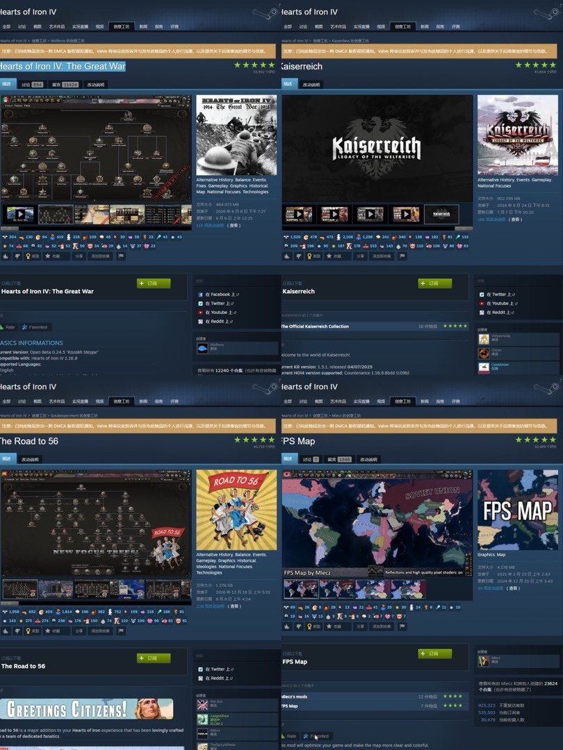 钢4:一战剧本、第三帝国、56之路、fps地图