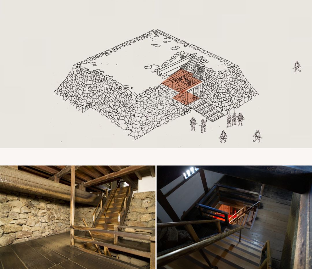 地下二楼是天守的 出入口 ,被安置在在石垣中。地窖(石墙裸露的构造)是 现存几乎已经没有 的古城特有的建筑。 即使敌人从 突破入口进入 ,也可以利用这个狭窄的 地下道 和陡峭的 楼梯 ,可以更好地起到 保护作用 。