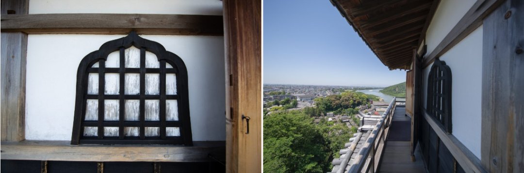 开口部的两侧设置了原本是寺院佛堂等资格极为高贵的 「华灯窗」 ,不过,这个是被贴在墙面上的装饰实际上 没有窗户的作用 。