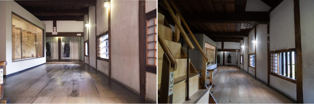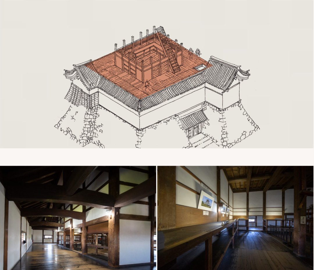 楼梯右手突出来的房间,是为了 击退敌人攻击 的房间,叫 附橹 。从这里可以很清晰地看到底下的 入口处 ,敌人如果打算撬开正面的入口进攻,就可以 用弓瞄准射 击。这个当时的战术叫做 横矢架 。