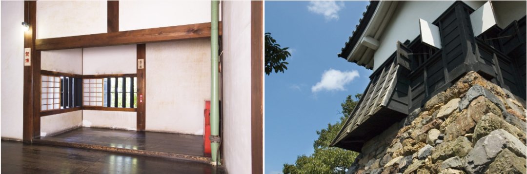 在1层的北侧东西角,石垣外侧突出的部叫做 落石陷阱 。为了防止敌人攀登石垣进攻,可在那里 扔石头 去砸敌人进行防卫。当然也设置了 小型窗 口 可以从那里射箭或 开枪 进行防御。