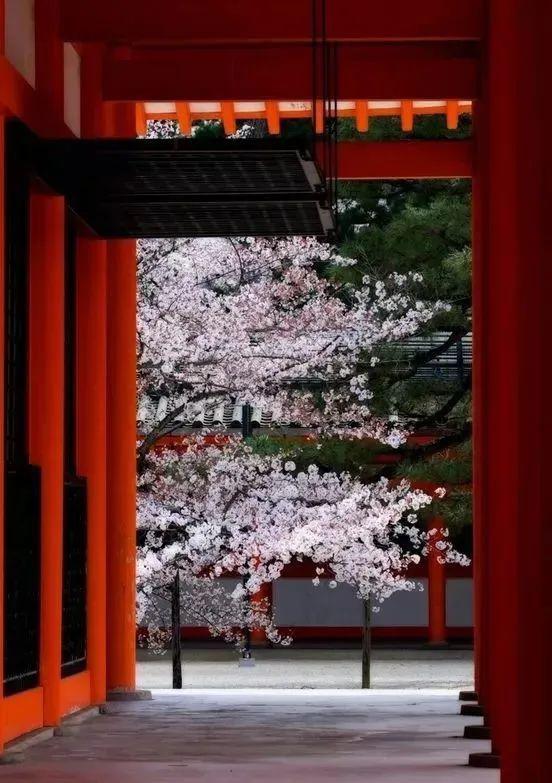 春季一入赏樱期,穿过南神苑入口的就是一片绝美的 八重红枝垂樱林 。 朱红色的宫殿和粉色的樱花交相辉映 ,不管从哪个角度拍都是绝景。
