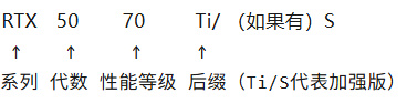 :常见的有 Ti、SUPER 等,一般表示加强版,性能相比无后缀型号更优,如 RTX 4070 Ti 性能强于 RTX 4070。