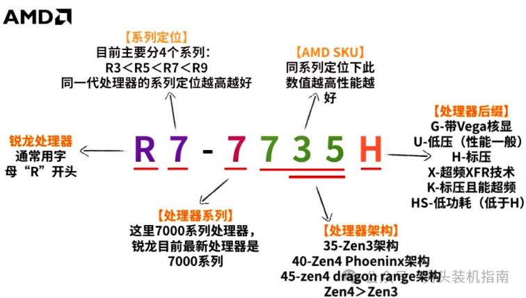 HS:高能效标压,如 R7-7840HS,Zen4 架构主推,性能接近 Intel H 系列,适合全能本、轻薄游戏本。