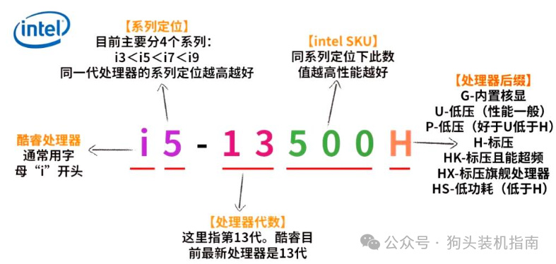 H:标压,如 i5-13500H,性能较强,用于游戏本、高性能轻薄本。