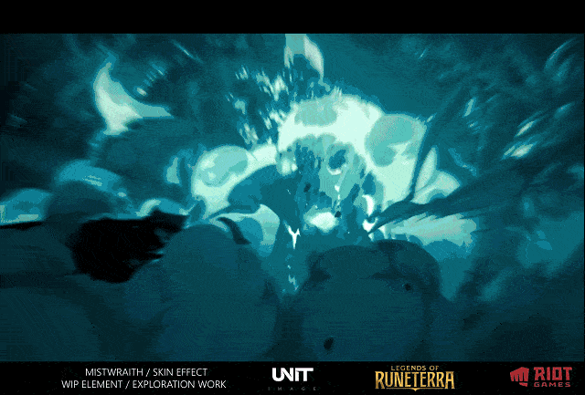 这是拳头游戏《符文之地传说》的一个预告片中的镜头, 这里的特效也是三维模拟后实现的三渲二效果。