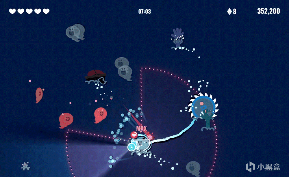 这个角色的特殊能力,是所有的“后坐力反转”,这样玩家鼠标点击时,相当于让船向那个方向前进,大大简化操作难度。