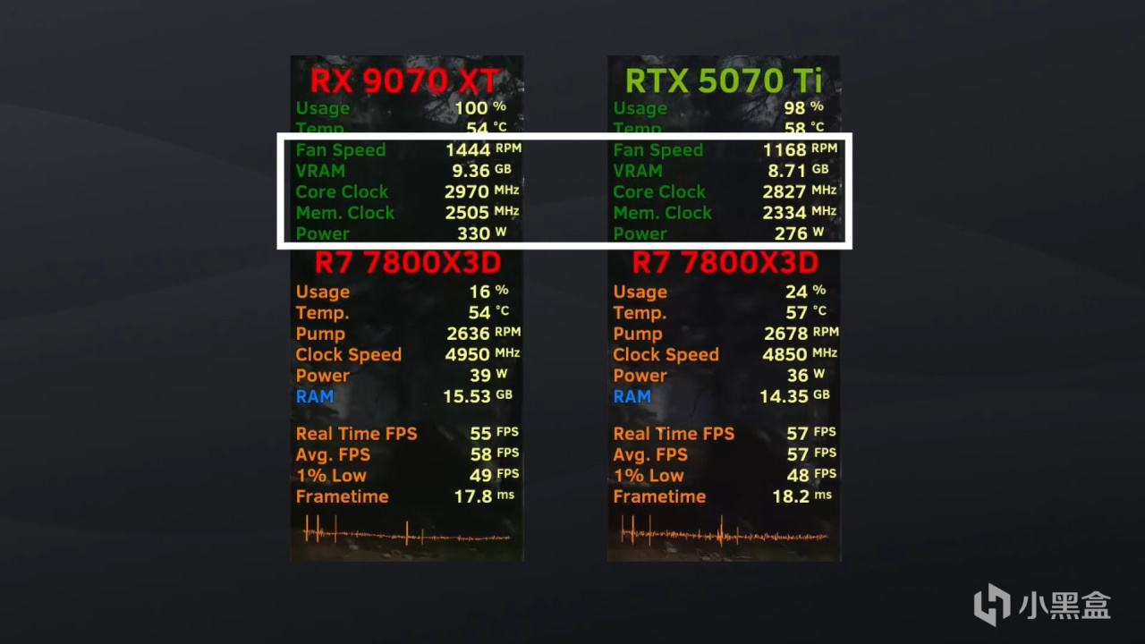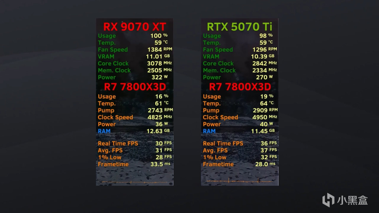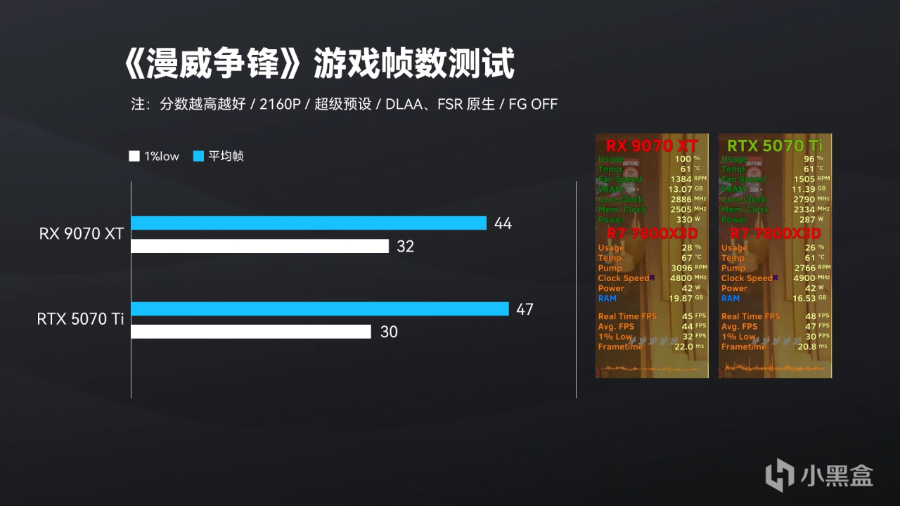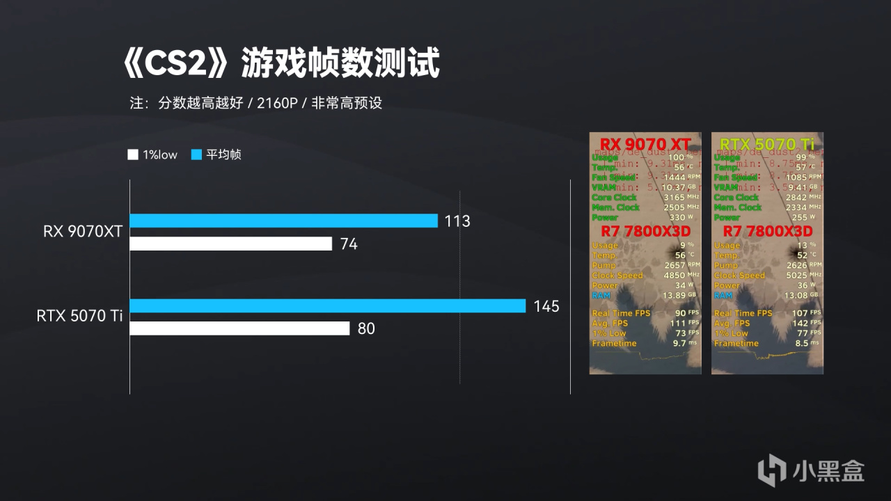来到了网游之中,CS2的帧数还得是看N卡了,5070Ti在平均帧上是要高于9070XT约22%,而1%Low帧方面也是同样5070Ti要更高许多,差距来到了8%,如此之大的帧数差距,可见CS2这游戏确实是A黑。