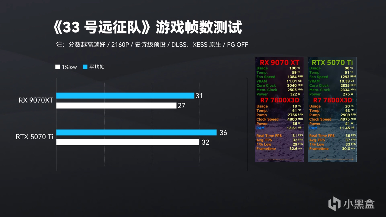 然后来到了今年发布的33号远征队中,5070Ti以5帧的优势战胜了9070XT,不过两张显卡在原生4K下的帧数表现均是只有30多帧数。