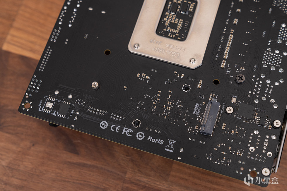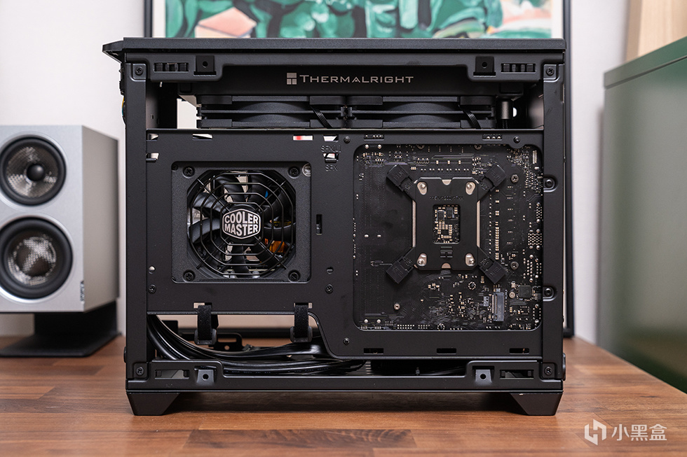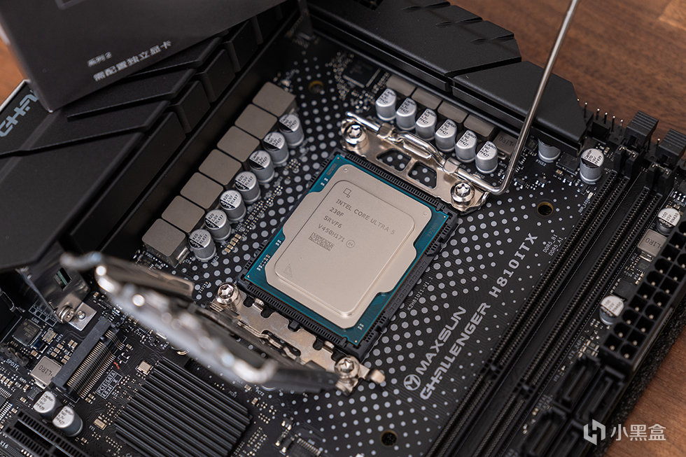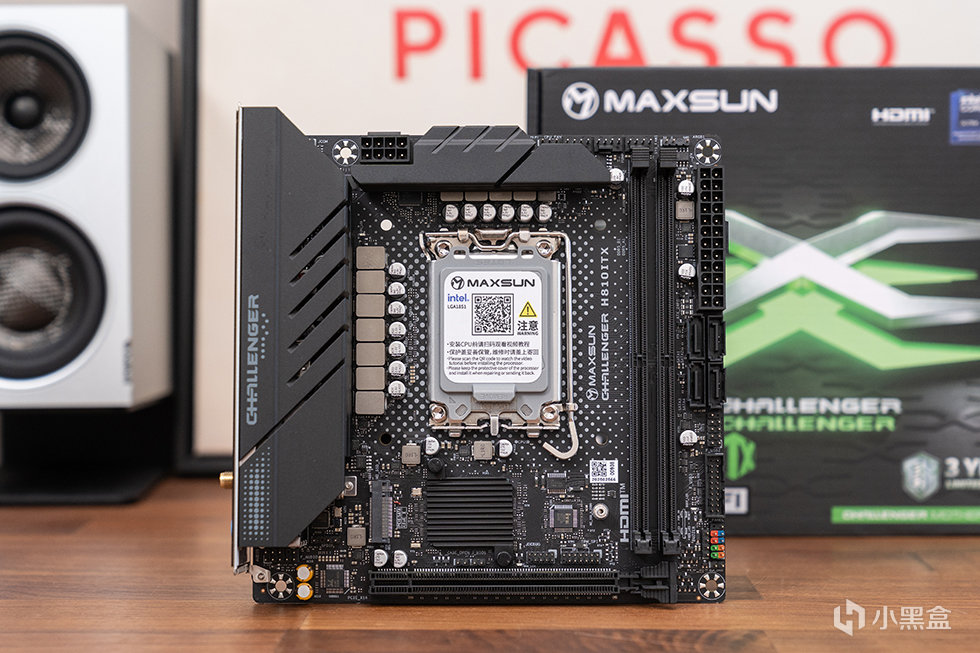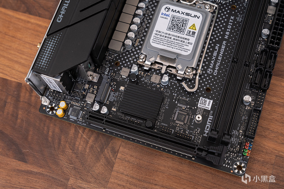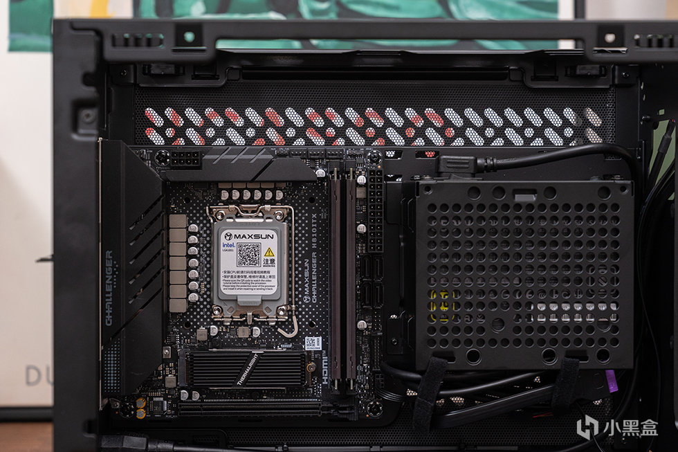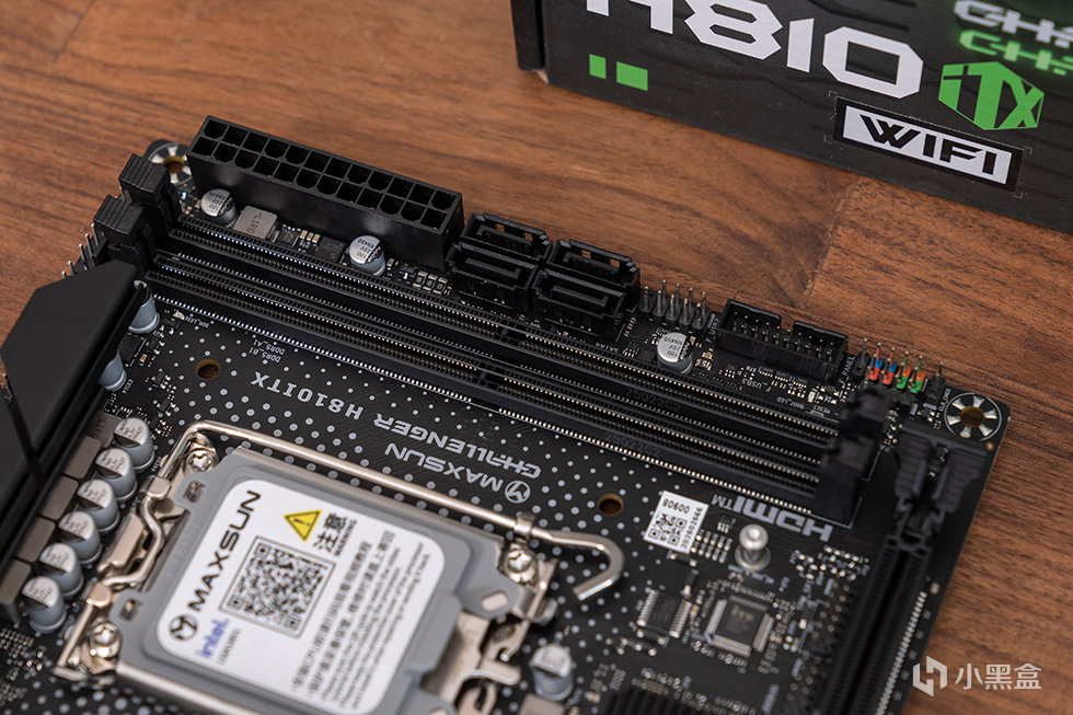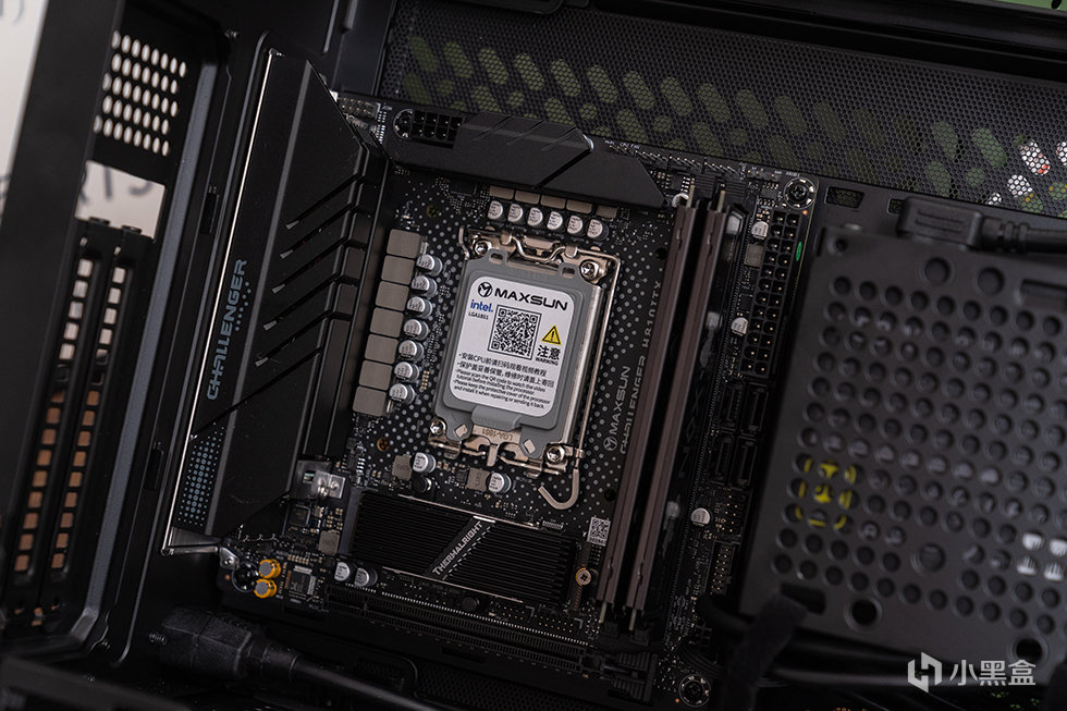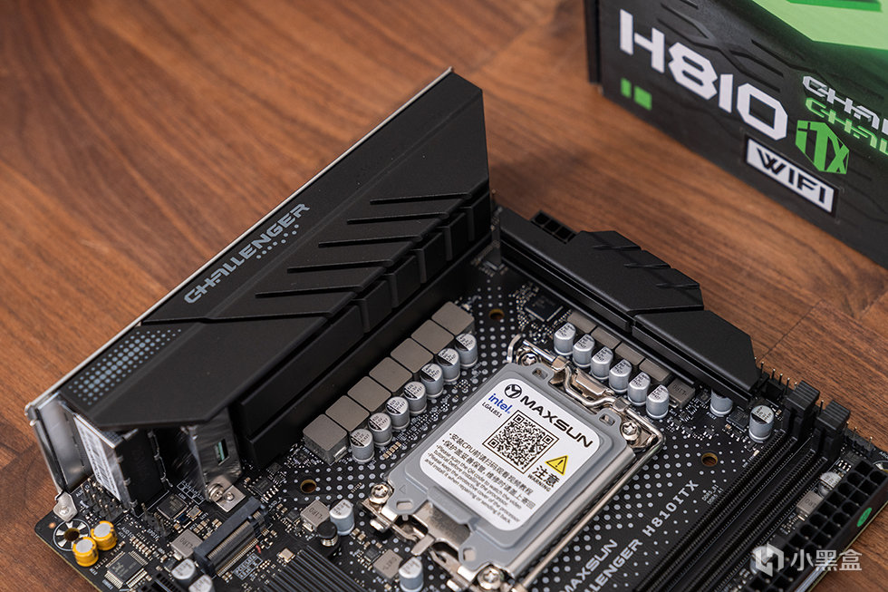 主板选用铭瑄 MS-Challener H810ITX WIFI,标准ITX版型,基于英特尔H810芯片组。采用了黑色 PCB 设计,供电区域大范围覆盖合金散热装甲,提高散热性能的同时提高主板外观质感。