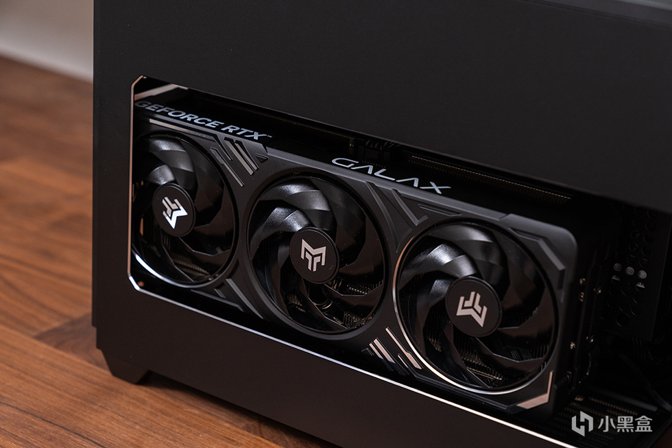 影驰 GeForce RTX 5080 金属大师 黑金版 OC显卡厚约2.5槽,整体尺寸316.5*135.1*56mm(含挡板)。上盖延续铝合金一体压铸成型工艺,采用了全覆盖的设计,铝合金材质辅助散热,内部共有五条8mm热管和两条6mm镀镍复合热管,通过回流焊接工艺和合金压铸中框加强件,尾端以及侧面贯穿开孔设计为散热提供更好的支持。顶部没有额外的RGB灯效设计,只有GEFORCE RTX和GALAX的字样涂装。