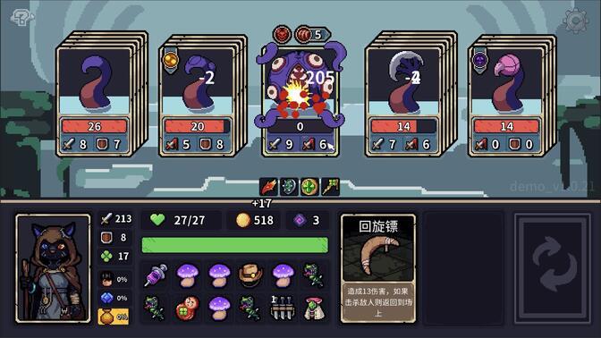 同样是最近上线的一款新游戏的玩法其实还是很特别的,首先是玩法的基础和小丑牌有非常相似的地方,同样是通过数值堆叠进行游戏,但游戏中有很多非常有意思的特殊状态,比如说在场景中你踩入陷阱可能会丢失一半的攻击力,而这种效果和很多肉鸽游戏不同的是,他给你的效果都是永久效果。