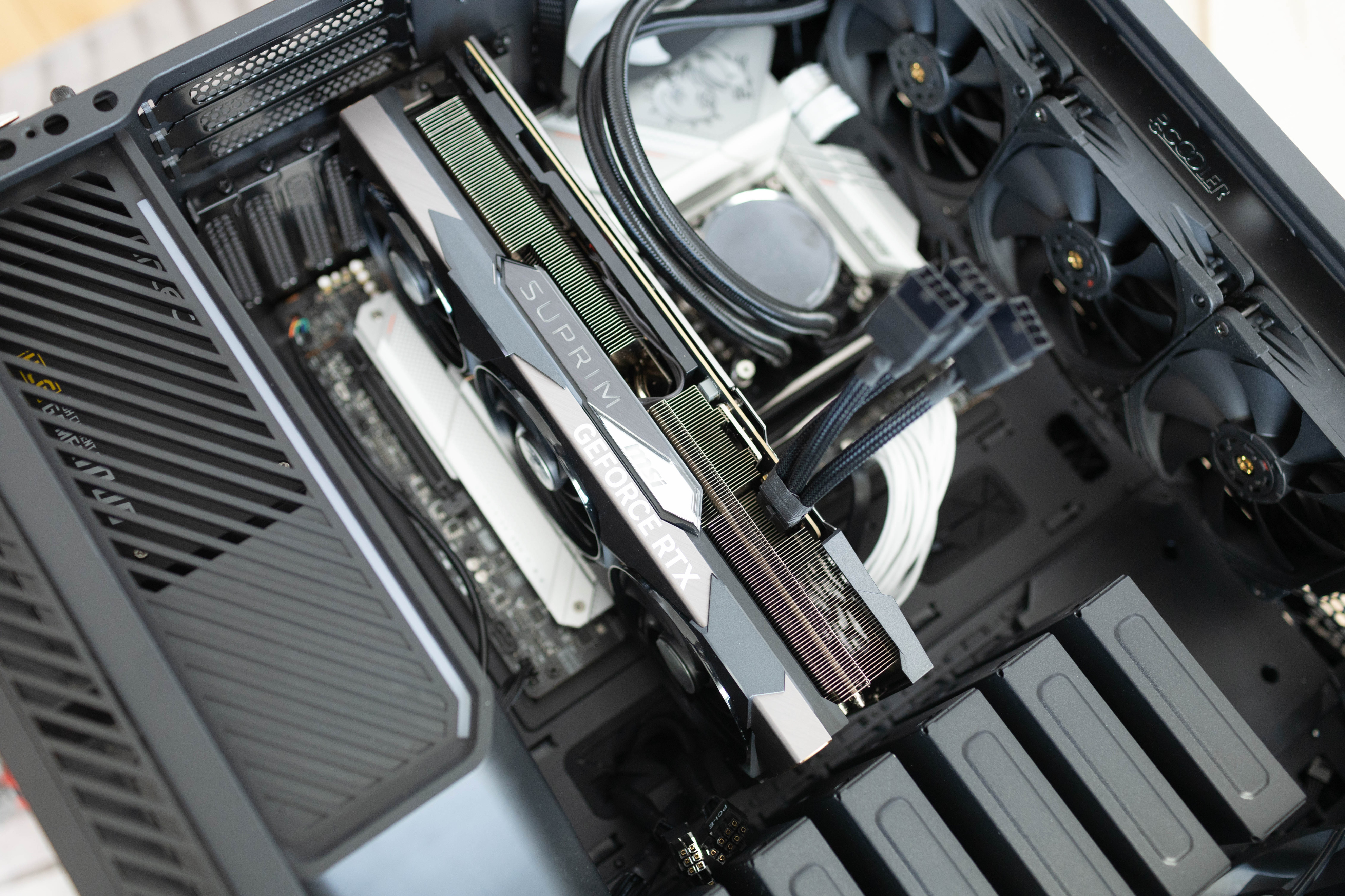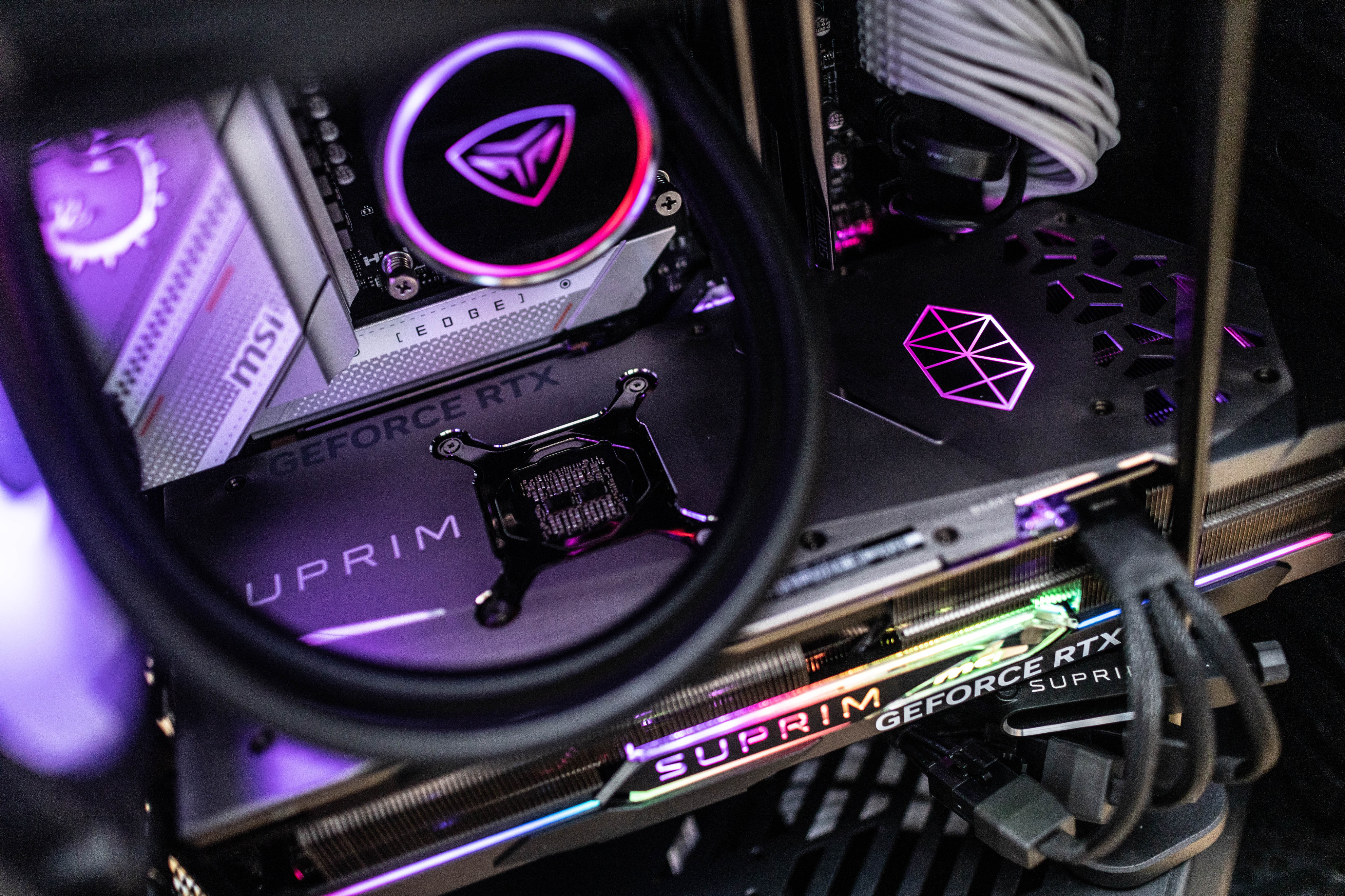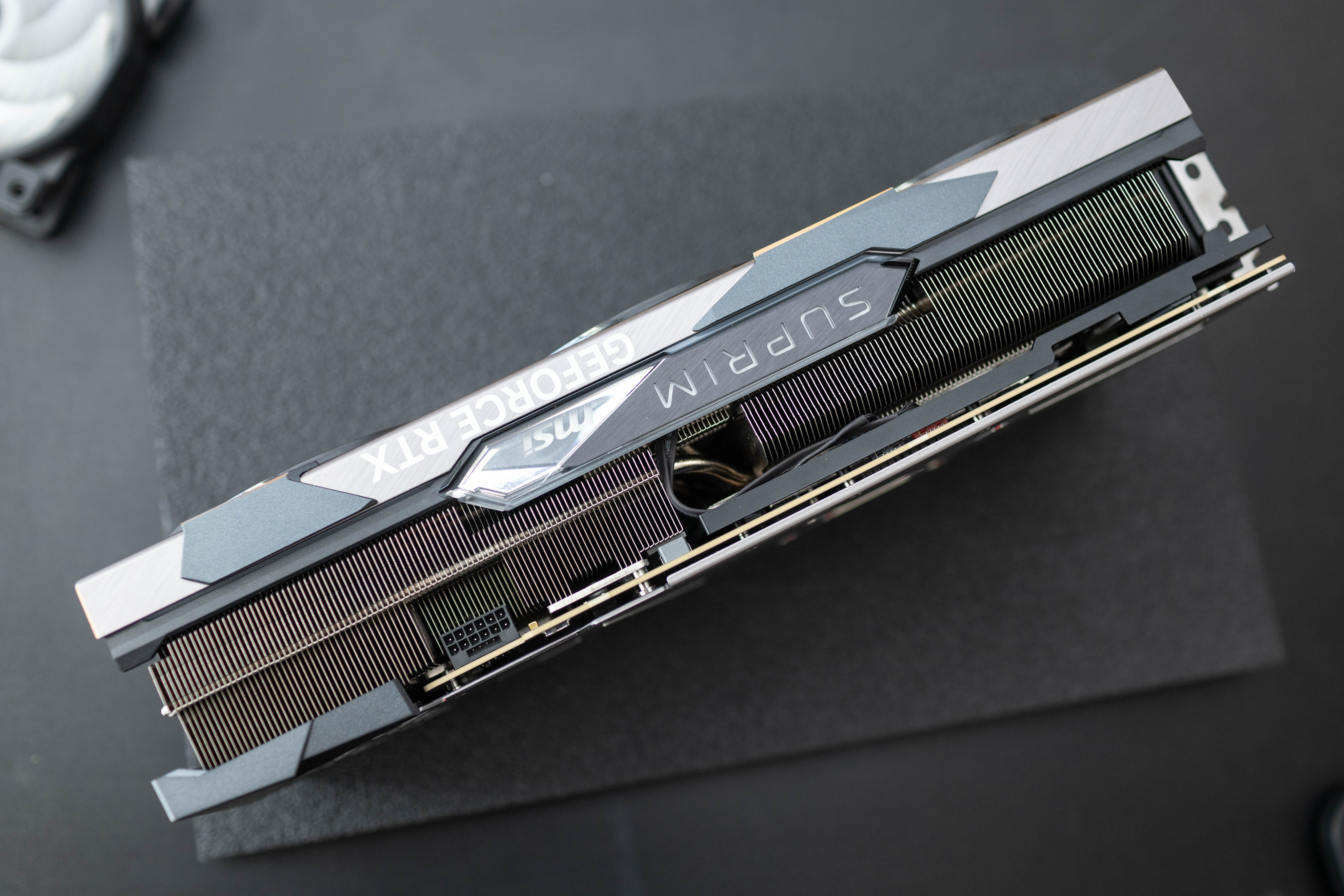 顯卡頂部可以看到超龍SUPRIM LOGO和GEFORCE RTX標識,均支持RGB燈光效果。
