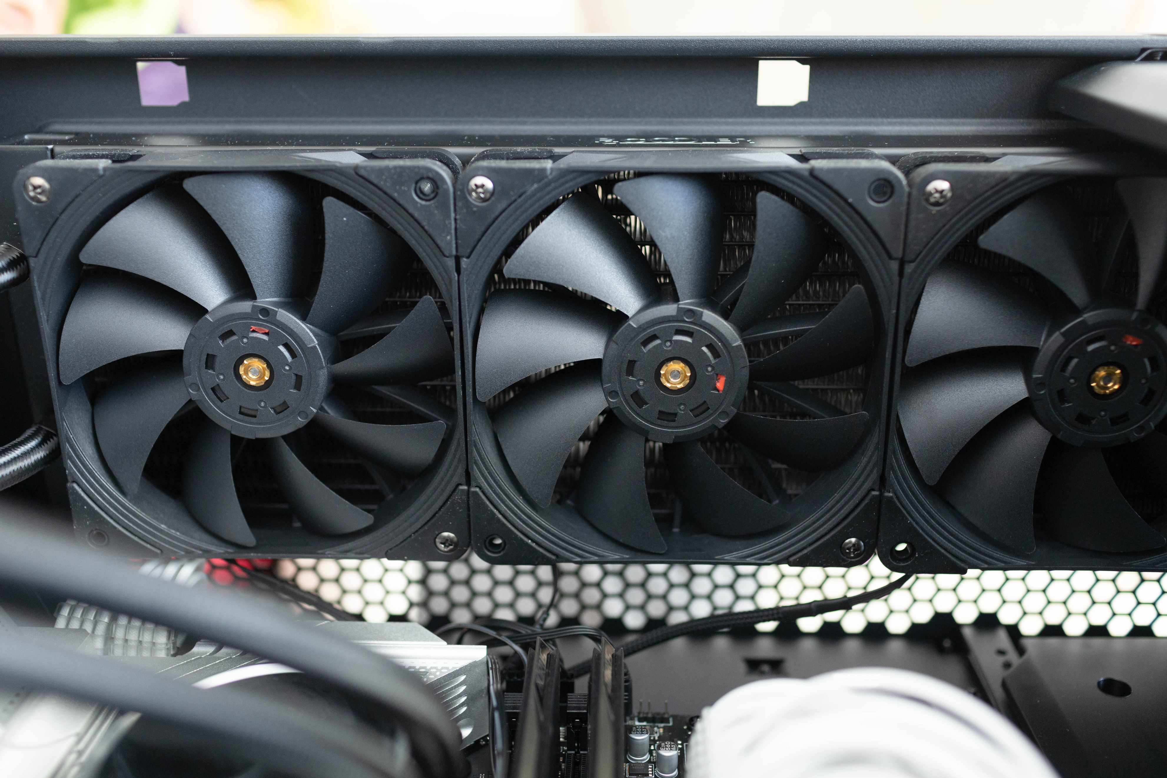 這款散熱器標配了三把高性能散熱風扇,結構方面相當特殊,特別是風扇軸心銅套一體鑄造的FDB軸承讓人眼前一亮。這種工藝的軸承有效減少工作中的摩擦和震動,降低噪音並提升風扇的使用壽命。風扇轉速600-1850RPM,全新的模擬渦輪增壓結構設計,可以讓它提供最大71.86CFM的風量和2.64mmH2O的風壓,性能表現首屈一指。
