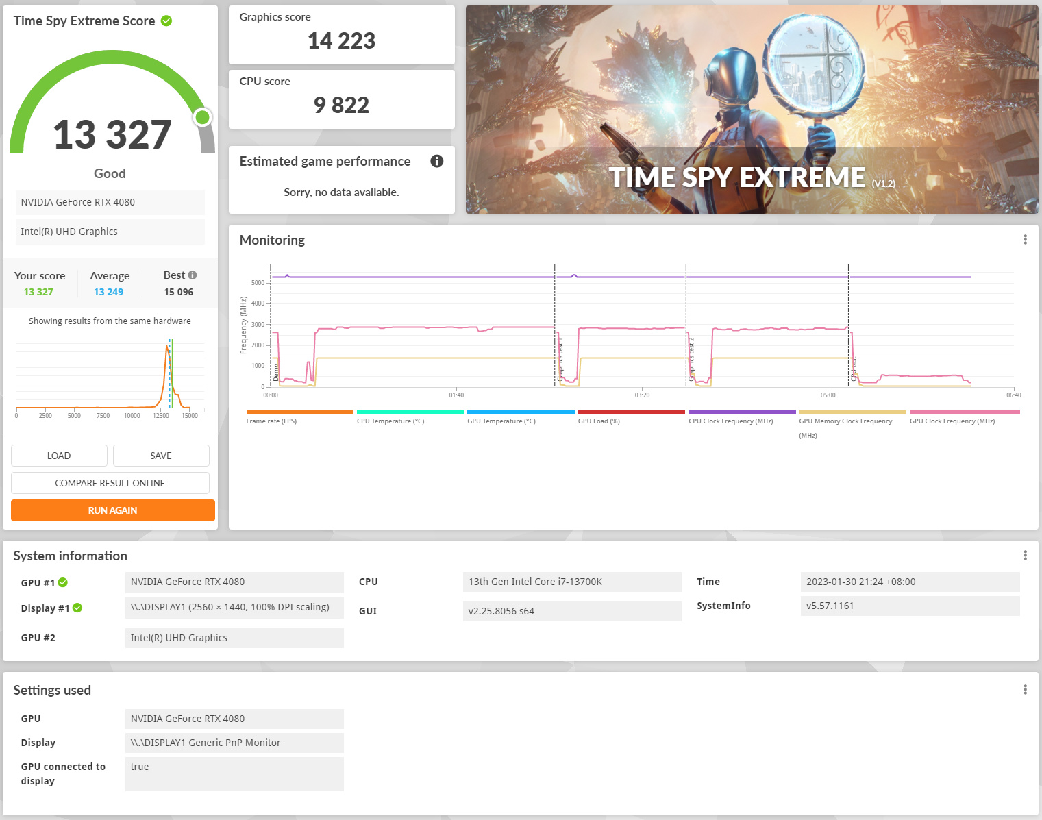 Time Spy Extreme綜合得分13327分,顯卡得分14223分,CPU得分9822分。