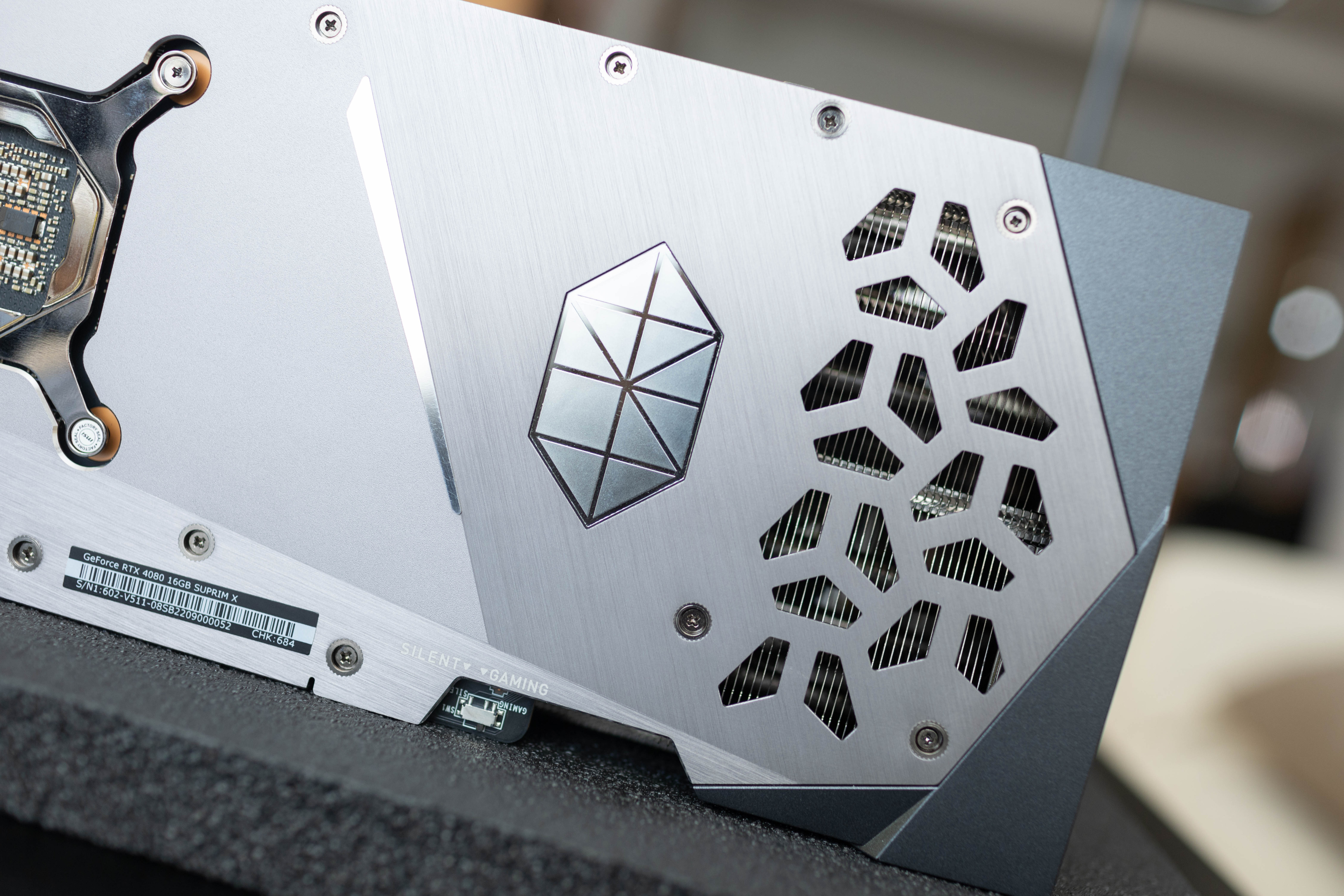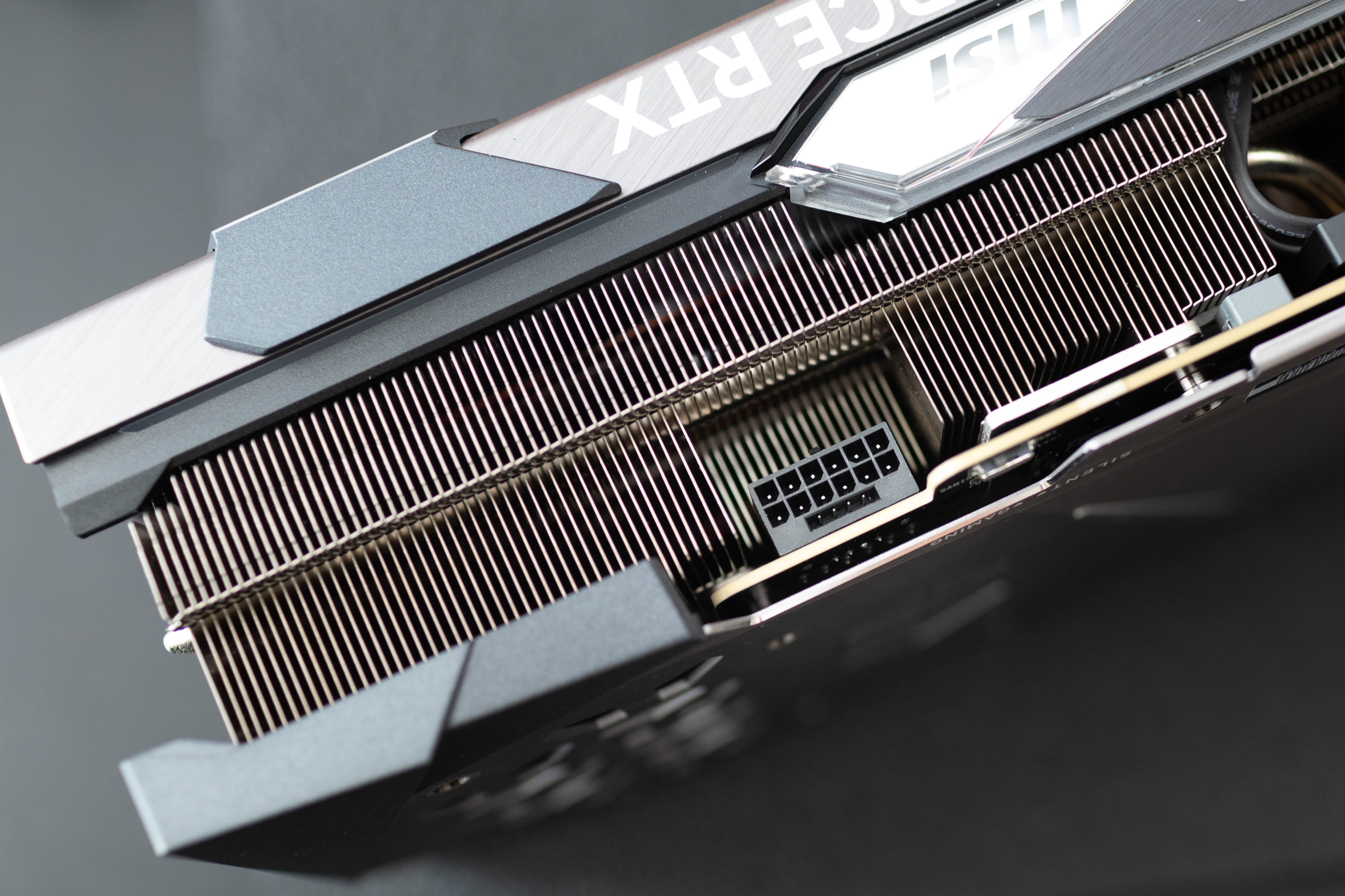 微星4080超龍在厚度方面相當驚人,內置特指的均熱板覆蓋GPU和顯存顆粒。導流鰭片尾部可以看到明顯的V型切口,這優化了鰭片內部氣流流動效率,可以加速熱空氣的排出。