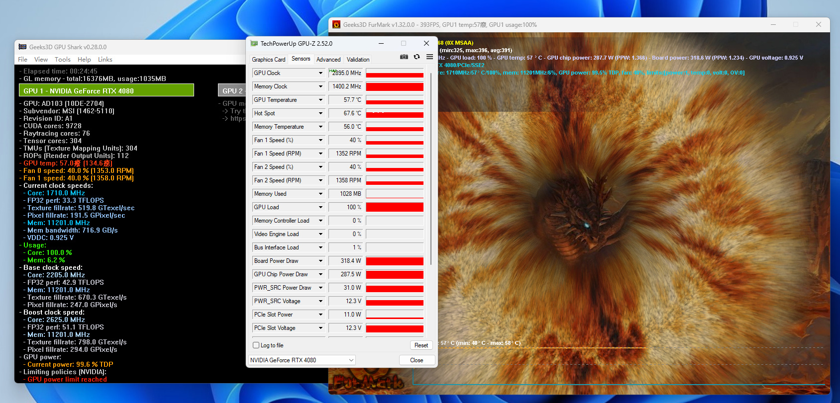 在FurMark單烤壓力測試中,MSI微星4080超龍顯卡在GAMING模式下,最高頻率達到2875MHz,顯存頻率 1400.2 MHz,顯卡核心溫度 58 ℃,功耗 320W 左右,溫度表現相當靠譜。