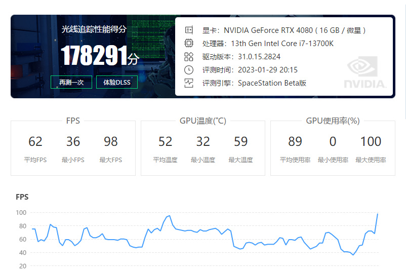 RTX光線追蹤性能測試,最終得分178291分。平均FPS穩定在62幀,GPU最高溫度達到59℃。