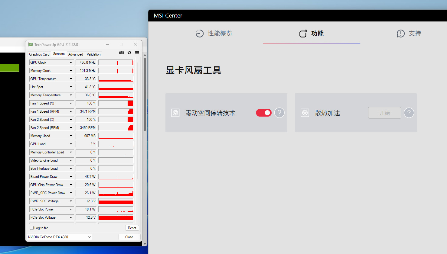 在一串測試後,我們打開MSI CENTER的顯卡風扇管理工具,還能設置顯卡風扇啓停以及一鍵散熱。開啓散熱加速後,可有看到所有風扇的轉速都達到了3500RPM的滿載狀態,並會在這個工作狀態下自動續航30秒來給顯卡急速降溫,可以看到烤機後顯卡核心溫度瞬間被壓制到了33攝氏度,這個操作和設計都非常人性化。
