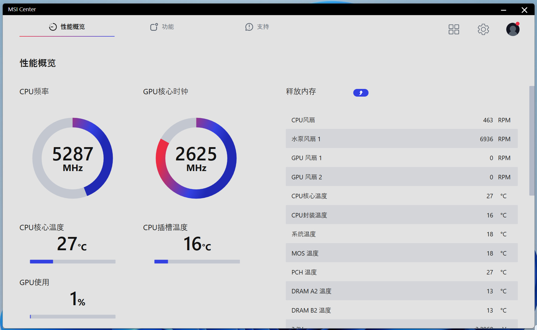 微星的MSI CENTER目前已經開發的非常成熟,系統初次開機就會自動提示安裝,各個設備的監控也相當準確,普通待機狀態下CPU溫度可以保持在27℃左右,GPU使用率在1-5%之間波動。