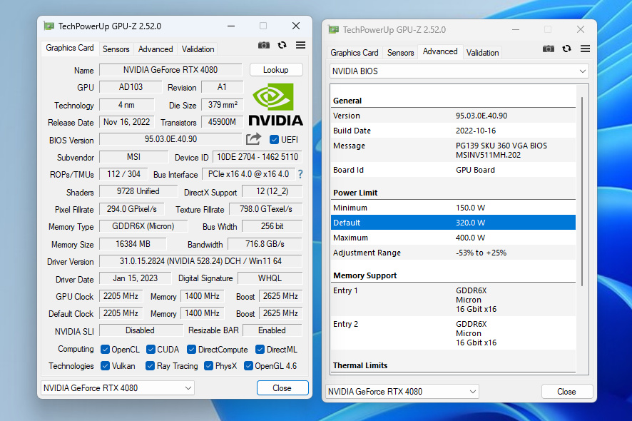 GPU-Z 信息顯示,顯卡型號識別爲MSI RTX 4080 SUPRIM X, GPU Base Clock 2205 MHz,Boost Clock 2625 MHz (+5%), Memory 1400 MHz 22.4 Gbps effective。微星4080超龍的 Bios 信息顯示,TDP功耗給到了320W ,最高可達 400W,Suggested PSU 700 W,因爲我這裏用的127K,所以電源還是上到1000W。單看顯卡功耗比起上一代RTX3080的370W來說,要優化了不少。