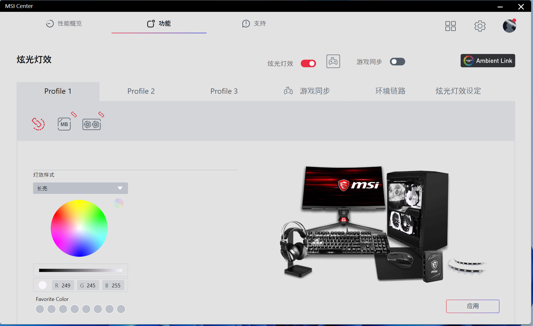 通過MSI CENTER的炫光燈效模塊,你可以進一步管理主板,顯卡,內存,甚至外設的燈效,軟件內置預設相當豐富,你甚至還能聯動遊戲表現來定製各種DIY效果來裝飾自己的桌面。