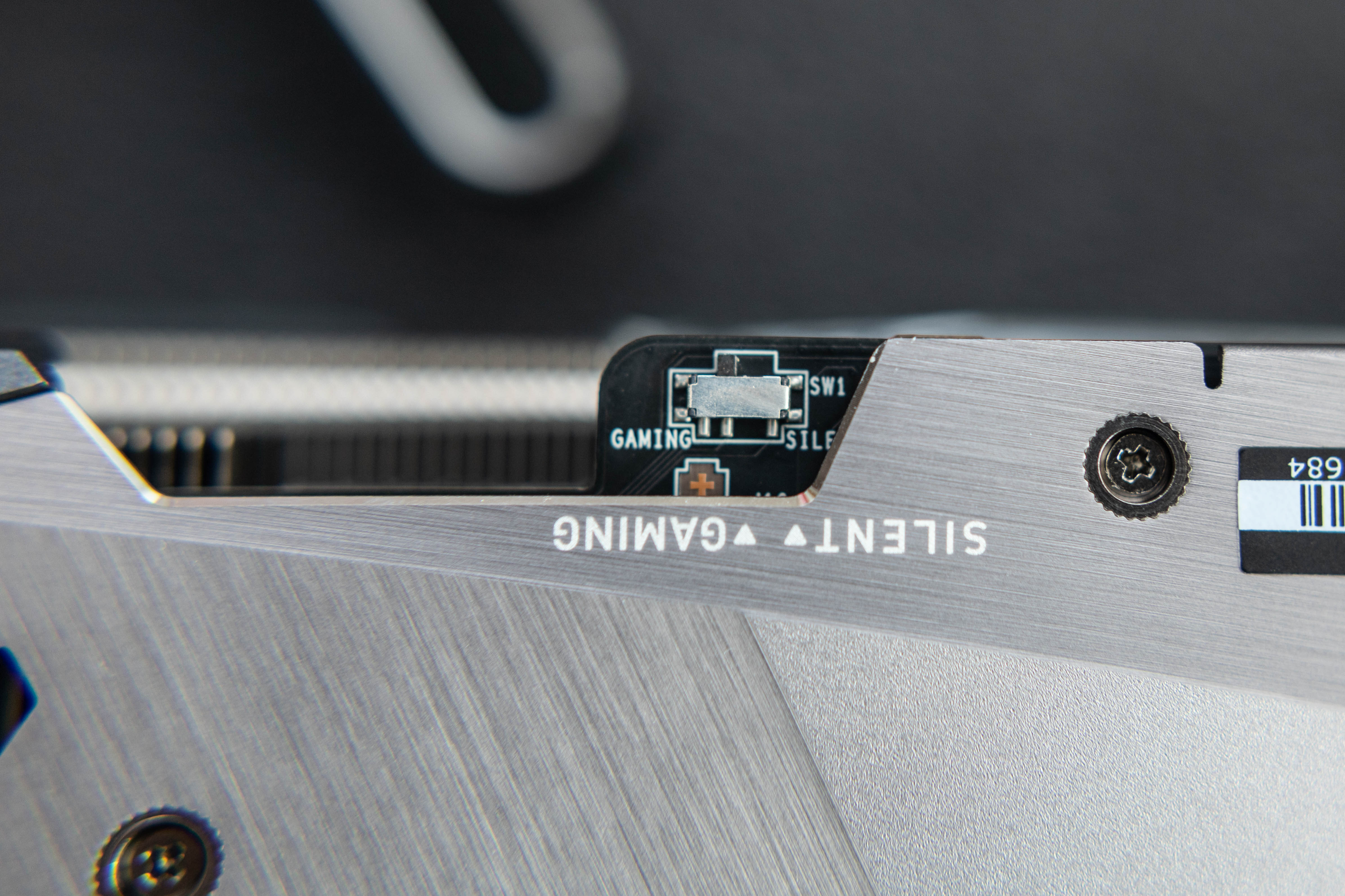 在電源接口附近,可以看到超龍系列標誌性的雙BIOS切換模塊,提供了更高性能的GAMING模式和低噪音的SLIENT模式。不過,相信入手這塊顯卡的玩家都會默認使用GAMING模式。
