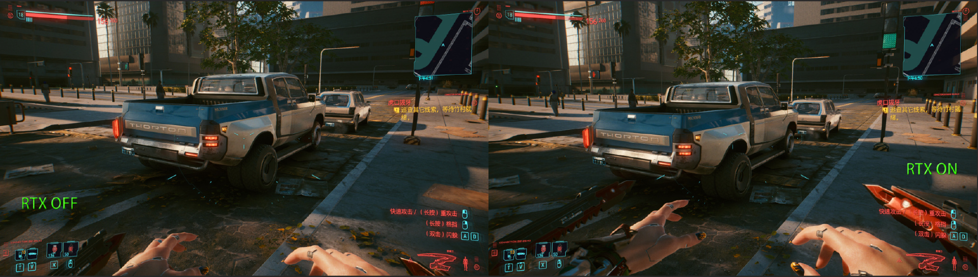 以我們熟悉的Cyberpunk 2077這款遊戲爲例,遊戲內開啓光追後可以看到畫面的質感和細節都有了量的提升。特別是金屬反光表現尤爲醒目。但是在畫質提升的同時,未開啓RTX時的FPS可以保持在120幀左右,但是一旦開啓RTX後,同樣的場景下幀率就跌倒了72幀左右。