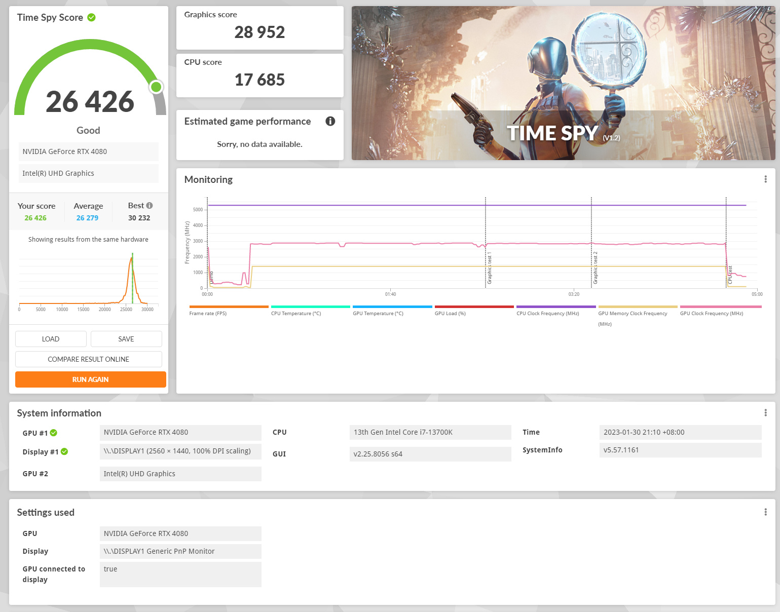 Time Spy綜合得分26426分,其中顯卡得分28952分,處理器得分17685分。