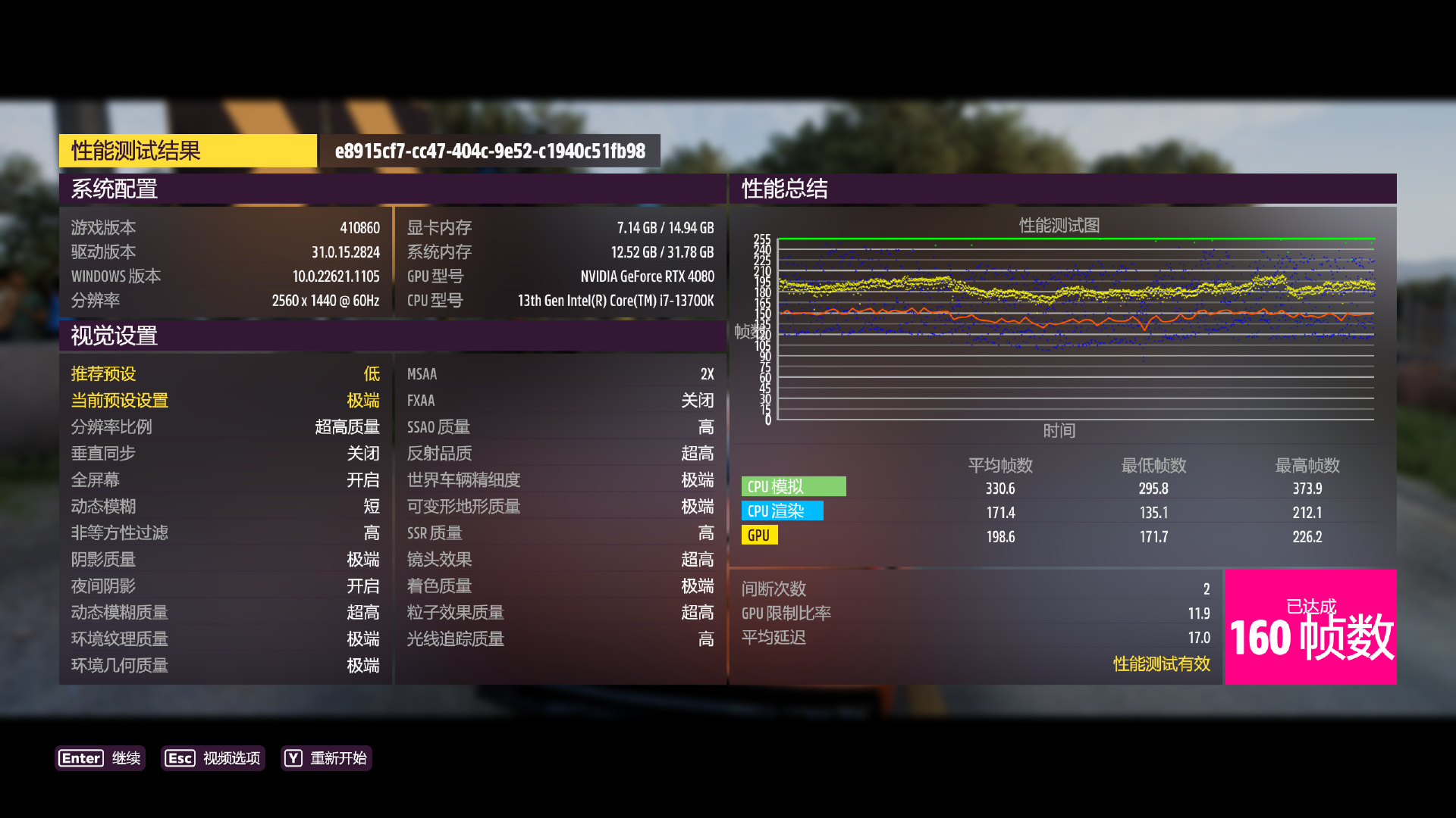 類似地平線5這樣不支持DLSS3的遊戲,在4080的性能加持下,開啓極端畫質模式也能輕鬆保持160幀的水平,遊戲體驗令人十分舒爽。