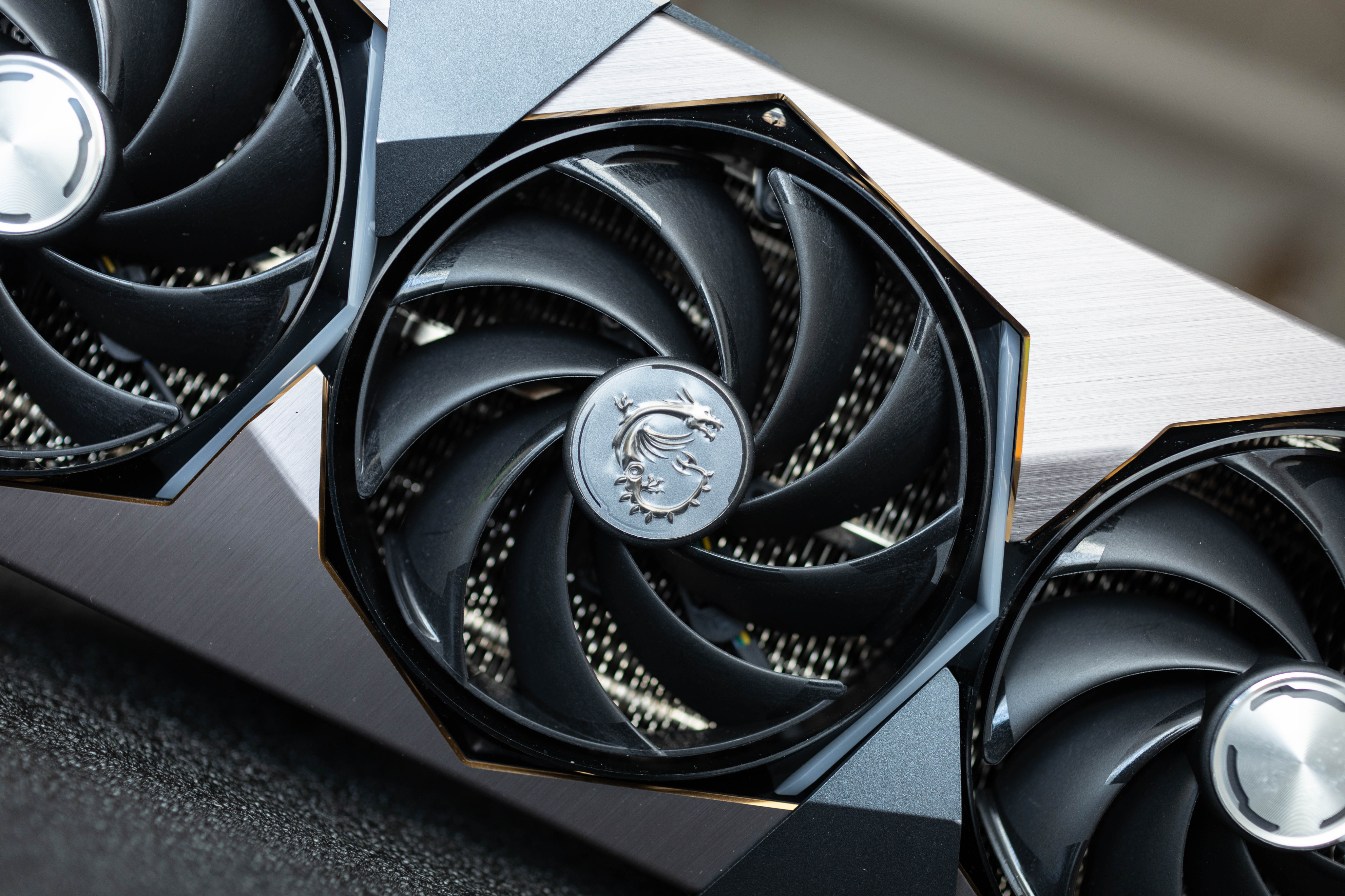 顯卡風扇採用的是微星全新的刀鋒7代設計,八角形嵌入式框架,3個風扇尺寸相同,中間的風扇帶有魔龍浮雕,扇葉分成3組連在一起,低速下也能提供壓氣流,配置雙滾珠軸承,工作時安靜高效。