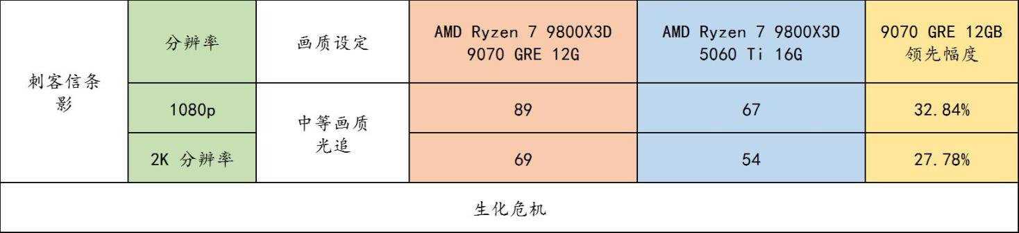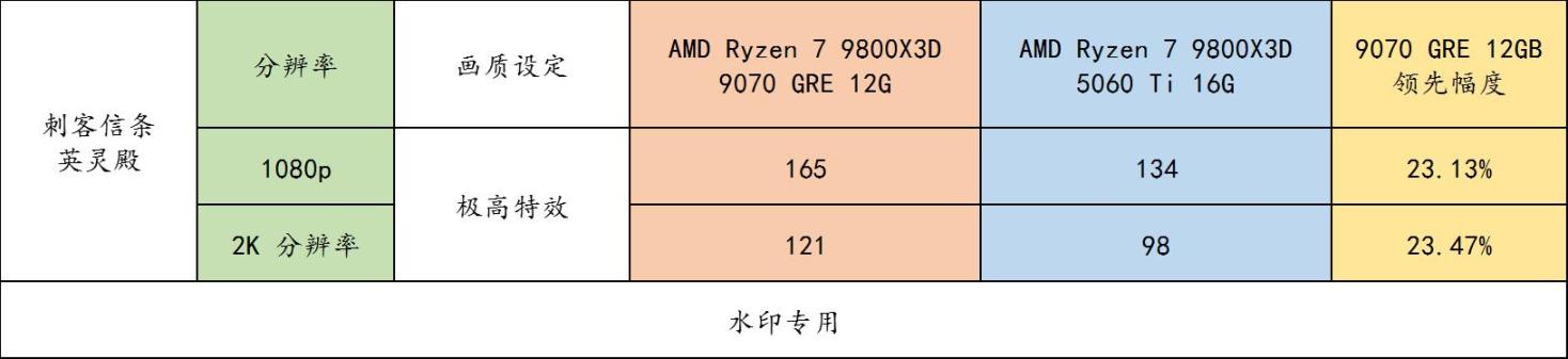 ▲ 《刺客信条 幻景》benchmark 实测,9070 GRE 全方位领先 5060 Ti 16GB 30% 的游戏流畅度,再次验证了在光栅游戏的世界里,9070 GRE 就是比 5060 Ti 16GB 强很多!
