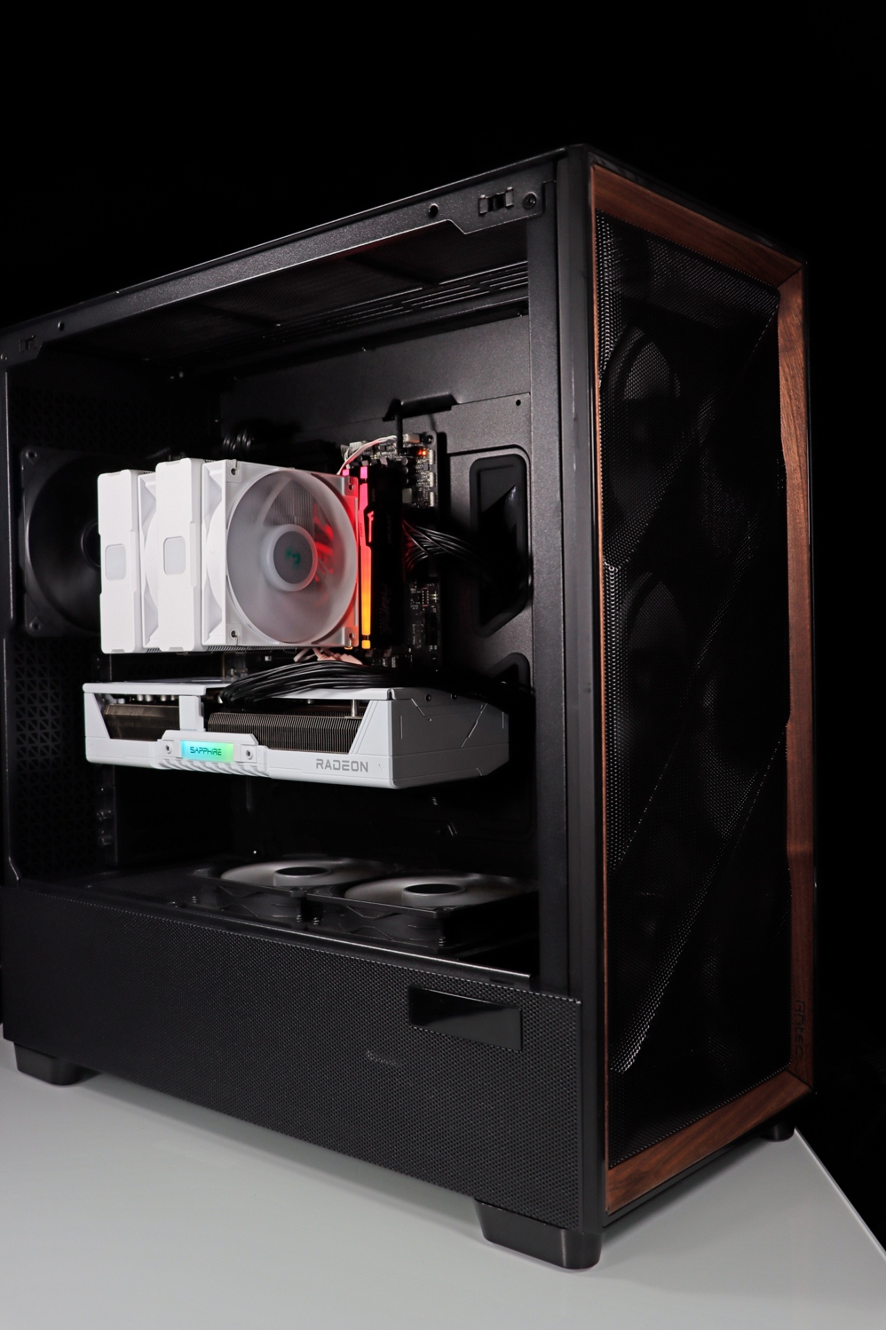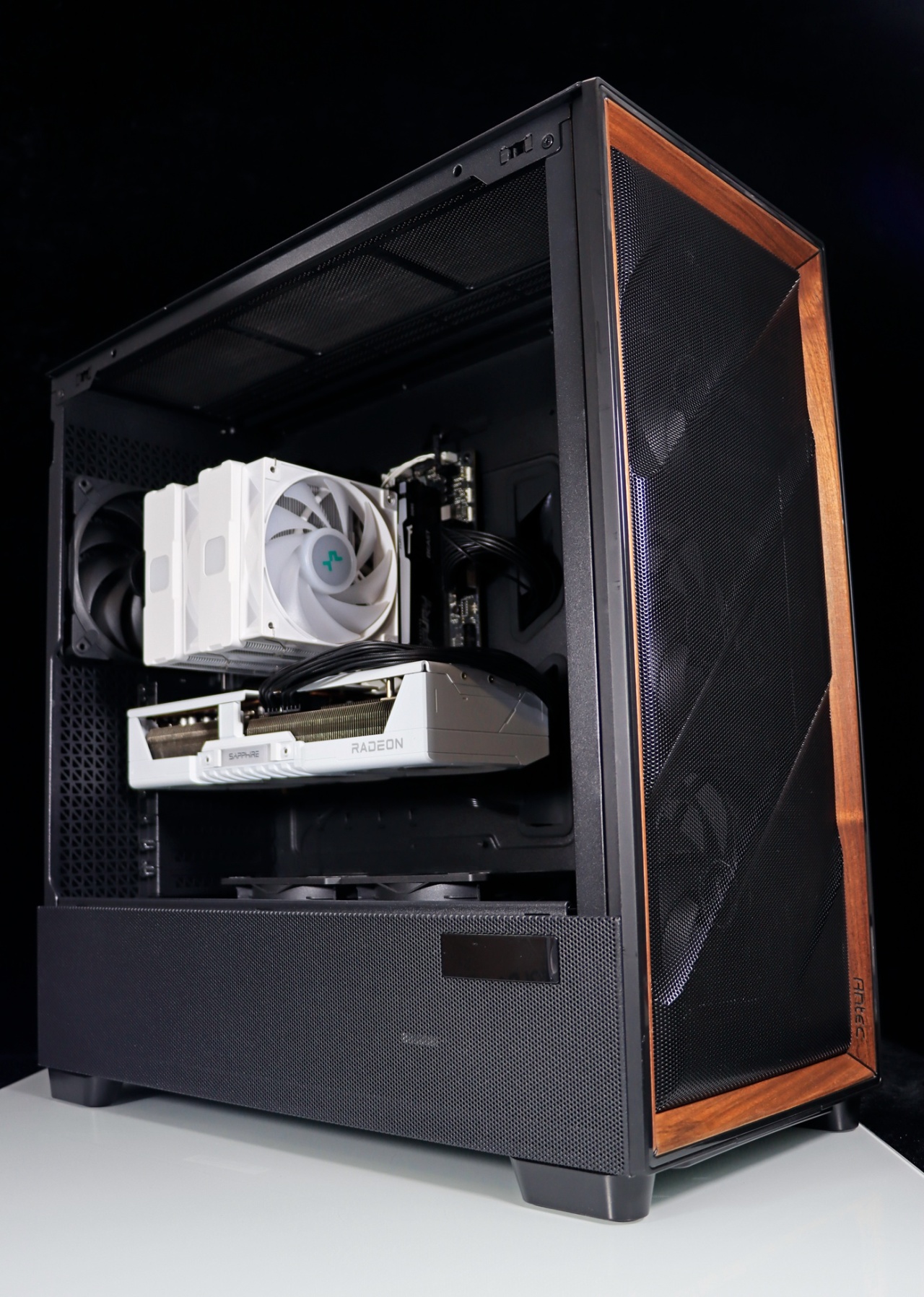 ▲ 机箱采用安钛克 FLUX PRO 这一款独特的胡桃木外观钢化玻璃侧透机箱。这款机箱拥有极为出色的散热风道,机箱标配 6 把 PWM 散热风扇,搭配上水冷散热器或者其他散热风扇,可以实现立体的散热效果。