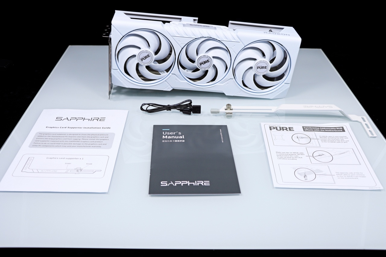 ▲ 内里包含有显卡本体,显卡支撑架,ARGB 信号线以及说明书、质保卡。