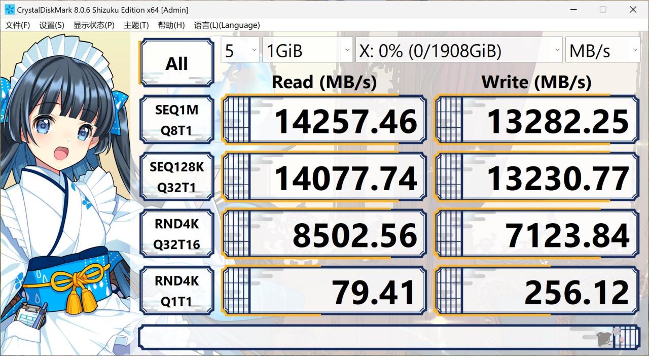 ▲ Crystal Dsik Mark 1 GiB 测试块实测,佰维 X570 PRO 天启 2TB 连续读取速度已经达到了 14257.46 MB/s ,连续写入速度也达到了 13282.25 MB/s,这个速度基本上是旗舰级 PCIe 4.0 X4 SSD 的两倍速度。