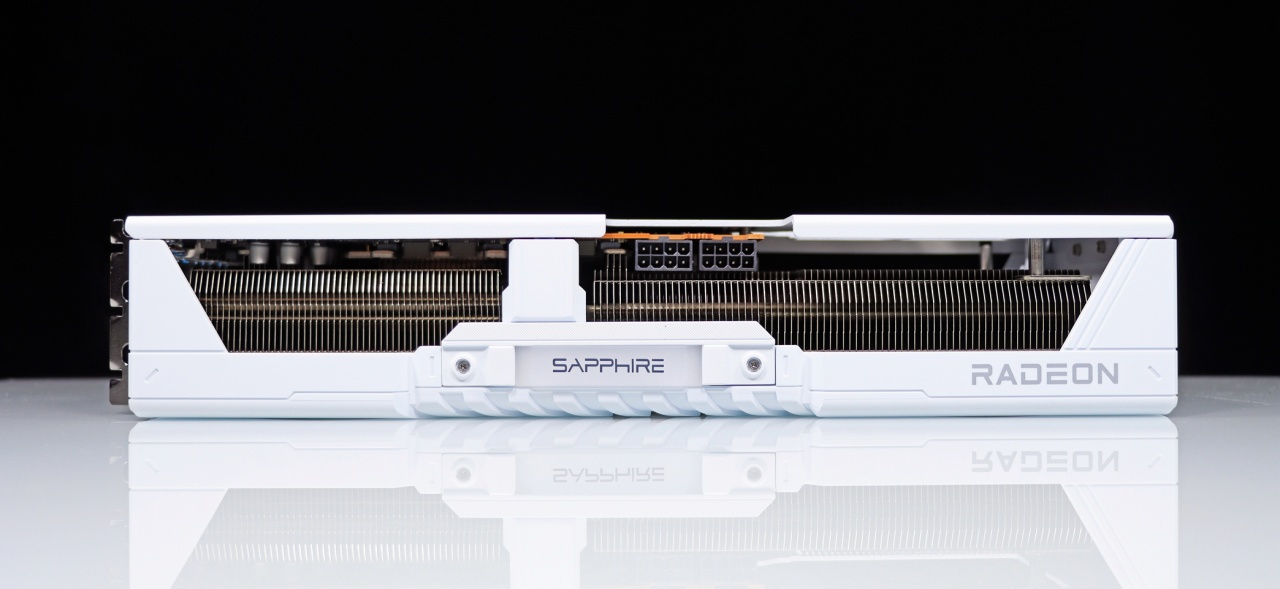 正中间的蓝宝石 LOGO 为上一代显卡广受好评的灵动岛,通电之后能呈现非常出色的流光溢彩,显卡的右边有 RADEON 的 AMD 显卡专属标识。