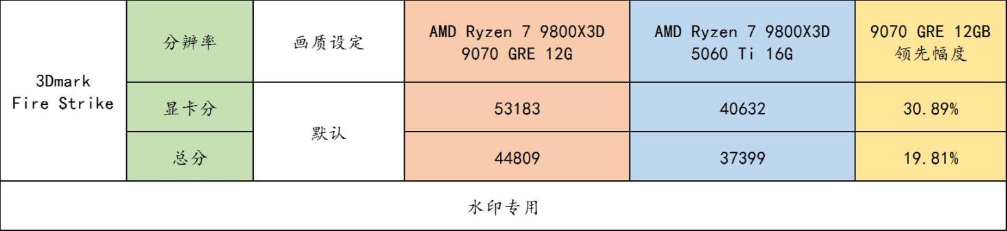 ▲ 3Dmark Fire Strike 实测对比,可以看到,在显卡分上 9070 GRE 领先 5060 Ti 16GB 达到了 30.89%,这个性能大概也是光栅游戏的总体领先幅度。