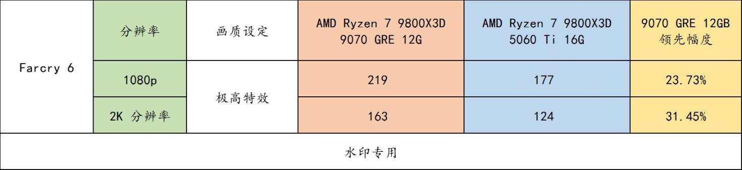 ▲ 《FarCry 6》孤岛惊魂 6 benchmark 实测,可以看到光栅为王的游戏里,9070 GRE 领先幅度大,甚至在 2K 分辨下,9070 GRE 领先 5060 Ti 16GB 的领先幅度扩大到 31.45%。