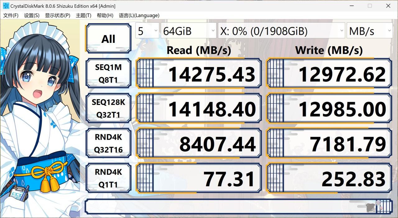 ▲ Crystal Dsik Mark 64 GiB 大测试块项目测试,得益于 2GB 的大容量高速缓存,就算是大文件块重载荷测试,也能保持超高的读写速度。连续读取速度仍保持 14275.43 MB/s 超高速度,连续写入速度也达到了 12972.62 MB/s,只有轻微降速。