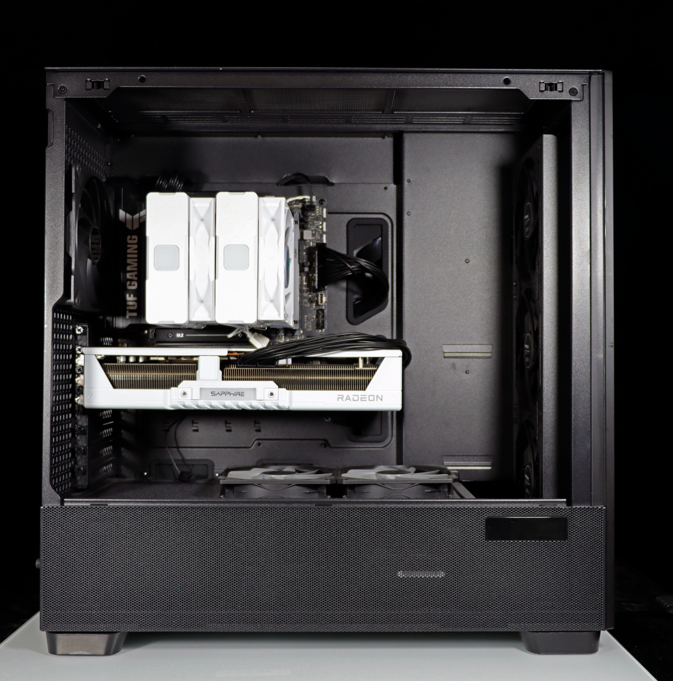 机箱前置三把 140 风扇,搭配上机箱后置的一把 140 风扇,形成出色的水平风道。
