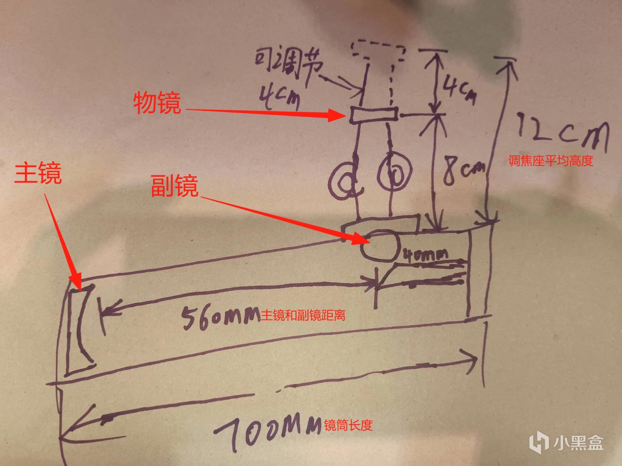 注意!!!拿镜片的时候一定要轻,手指捏边缘,别碰镀膜面,不然留指纹很难清理,影响反光,副镜的位置差几毫米没事,但主镜到副镜560mm这个距离尽量准,差太多会导致成像模糊,调焦座高度14公分是个参考,装的时候可以先松着螺丝,试看的时候上下微调一下,找到最清楚的位置再拧紧!!!