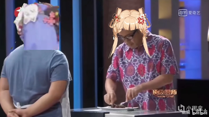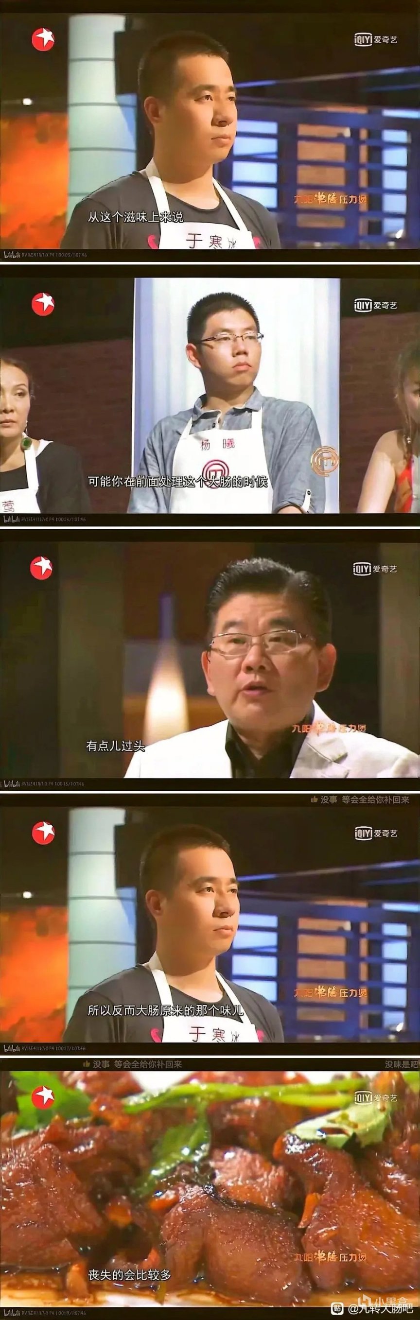 這個切片來源於一檔名爲《頂級廚師》的美食綜藝節目,其中一期節目的壓力測試環節裏,參賽選手們被要求在指定時間烹飪出評委指定的菜餚,也就是“九轉大腸”這道菜品。