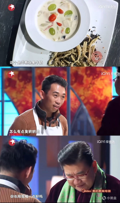 完全不需要任何旁白和語言,評委曹可凡從最初滿臉笑容,貼心的詢問這名17歲參賽選手的做菜細節,到大腸入口後想要“鯊人”的眼神,配合上俞濤的“精彩演出”,以及橫亙在兩人中間的“答辯風味”大腸,就已經提供了足夠的節目效果。