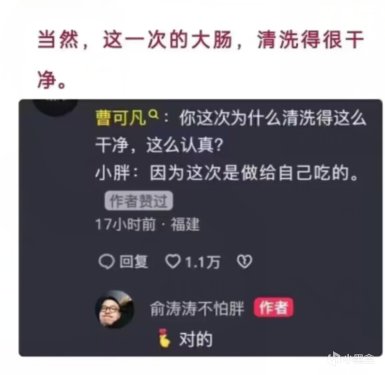 但在看過教學後,真相也就呼之欲出:真正讓曹可凡帶上“痛苦面具”的,是俞濤刻意沒有清理的、留在大腸內的豬網油(也就是俞濤口中的“原味”),而非大夥想象中的“答辯”。