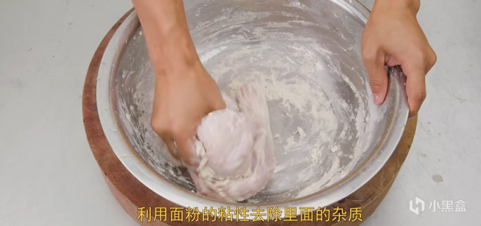 “洗”這個過程,不僅需要仔細清理大腸上的淋巴和髒油脂,後續還需要依靠麪粉的粘性來去除其餘的雜質,之後更是需要反覆清洗直到水清。