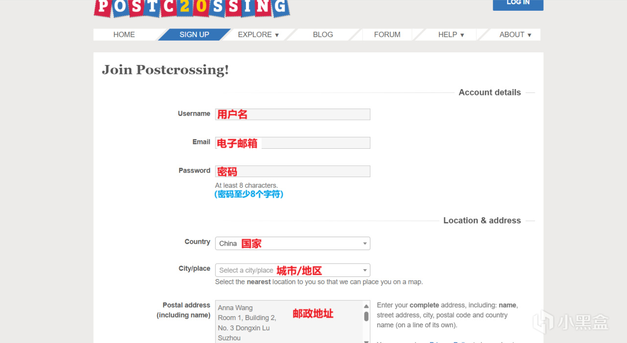 这里要注意,最下面的“邮政地址”一栏要按照国际信件的地址格式来写,且最好将自己的中英文地址都写上,方便国内外用户向您寄送明信片(如下图)