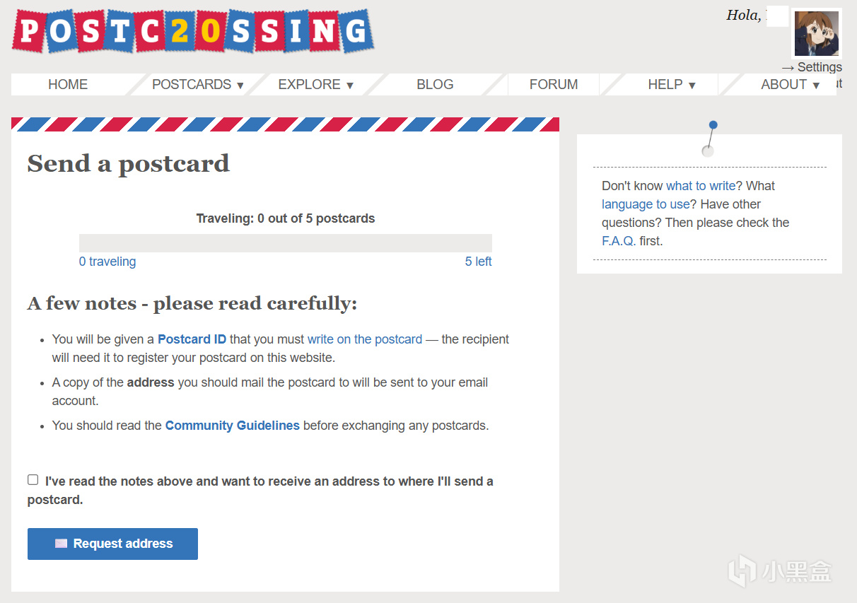 这个页面的提示主要告诉您,在您确认需要寄卡之后,您会被分配一个随机地址以及一个Postcard ID(明信片ID),您被分配到的地址也会同步发送到您的注册电子邮箱里